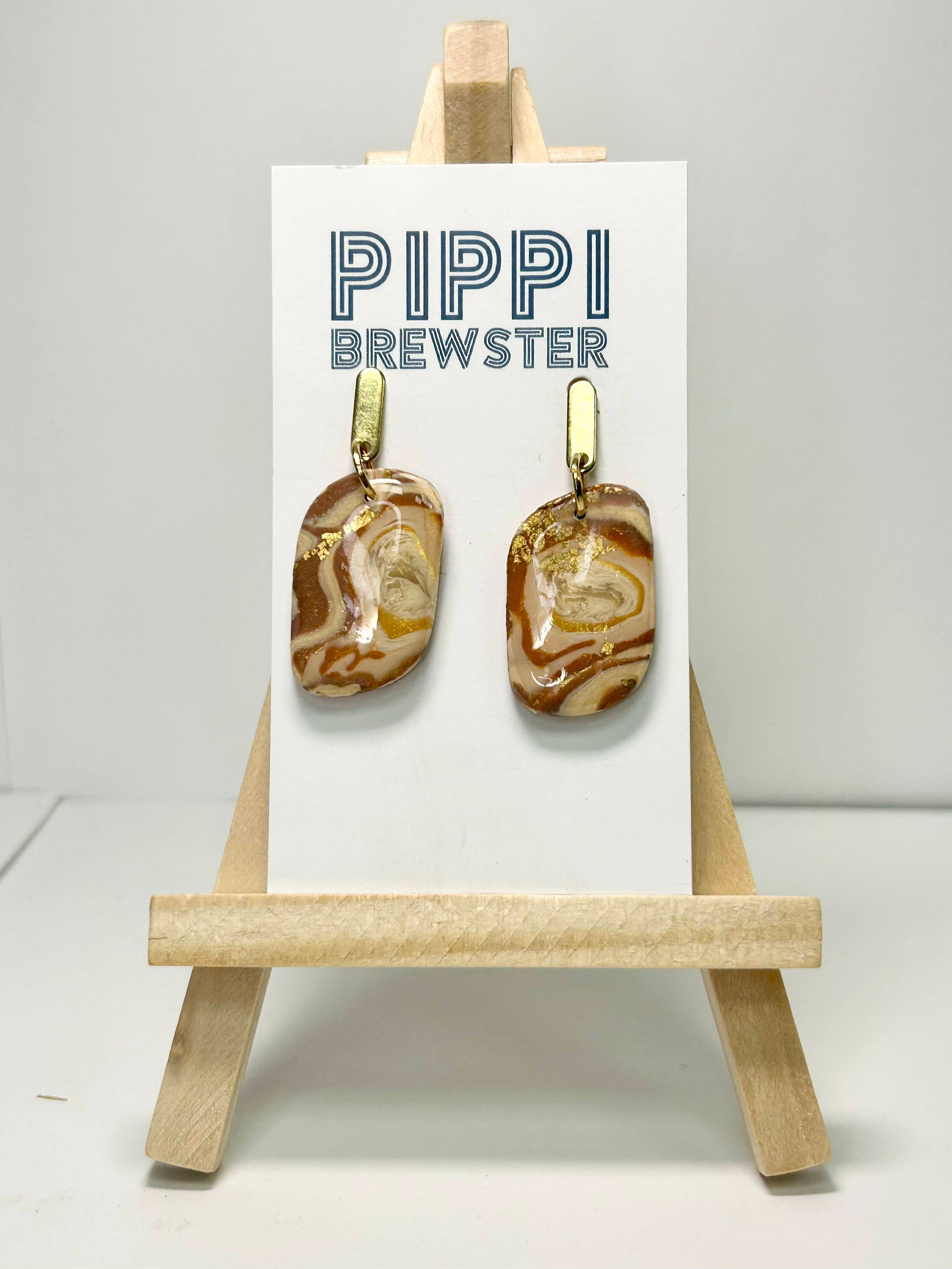 imitation agate clay earrings with red, gold, white, brown and metallic foliage. finished with resin. gold, rectangular studs. hypoallergenic.