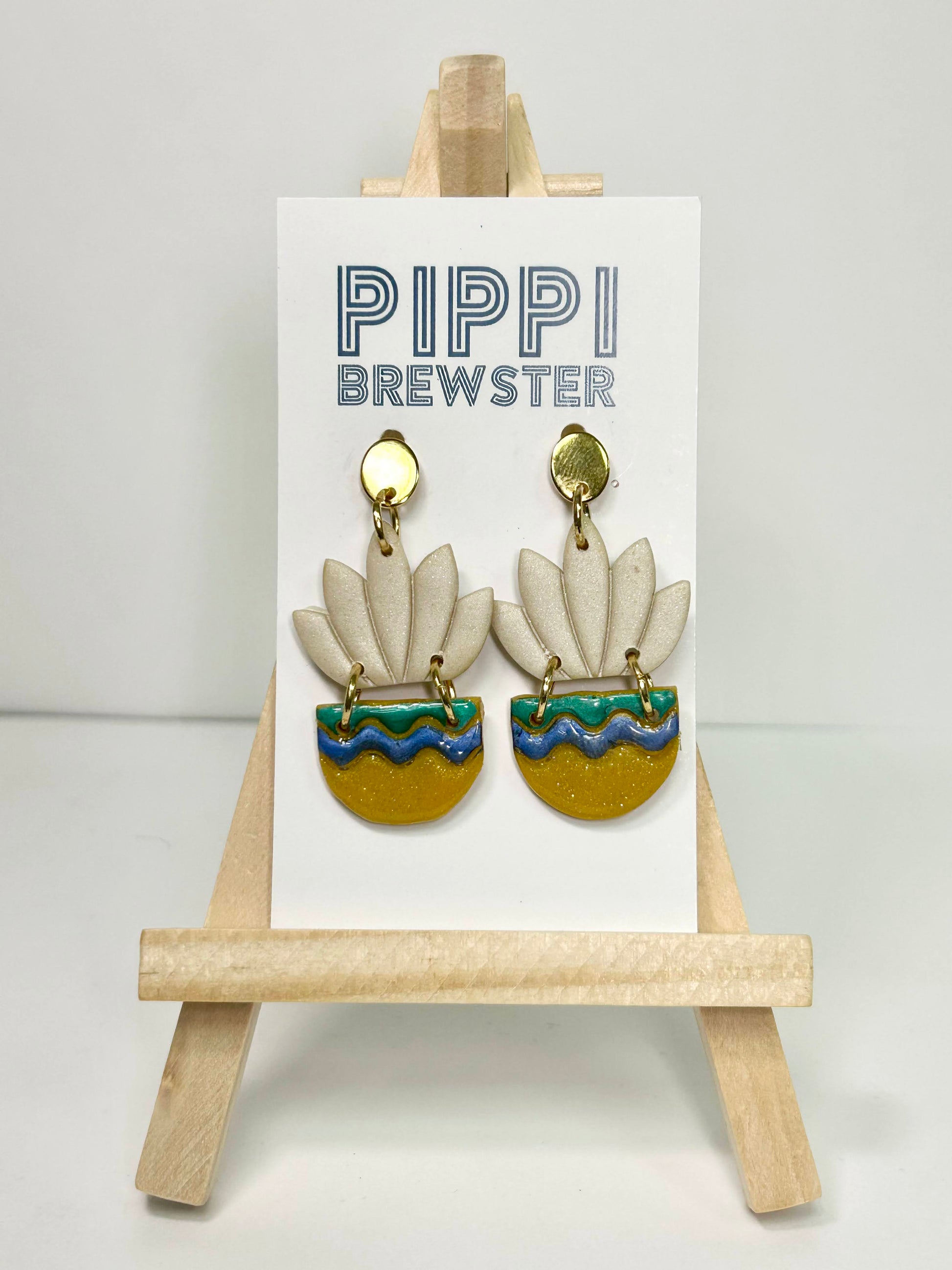 mustard, green and blue hand painted planter with resin finish. light tan foliage. gold oval studs.